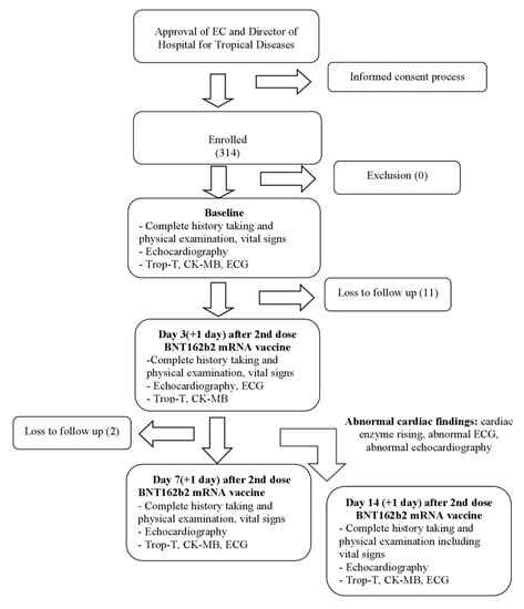 Recently, a Centers for Disease Control and Prevention (CDC) advisory committee on immunization practices identified a likely association between the two COVID-19 mRNA vaccines from Pfizer–BioNTech and Moderna, and cases of myocarditis and pericarditis [,,]. For the cardiovascular system, 4863 adverse events were reported among patients who received the BNT162b2 mRNA COVID-19 vaccine. Common findings observed with vaccines under study were tachycardia (16.41%), flushing (12.17%), increased heart rate (9.03%), hypertension (5.82%), and hypotension (3.6%) []. Although cardiovascular events have been reported with the COVID-19 vaccine, causality has yet to be established, because such cardiovascular adverse events are also common among the general public who do not receive the intervention []. Conducted during the implementation of the national Thai vaccination campaigns for adolescents, this study sought to characterize, classify, and evaluate the dynamics of cardiac function and electrocardiographic (ECG) abnormalities post-BNT162b2 mRNA COVID-19 vaccination to understand and identify cardiovascular effects that may predict cardiac complication by serial echocardiographic studies, ECG, and cardiac biomarkers for the early detection of subclinical myocarditis cases.