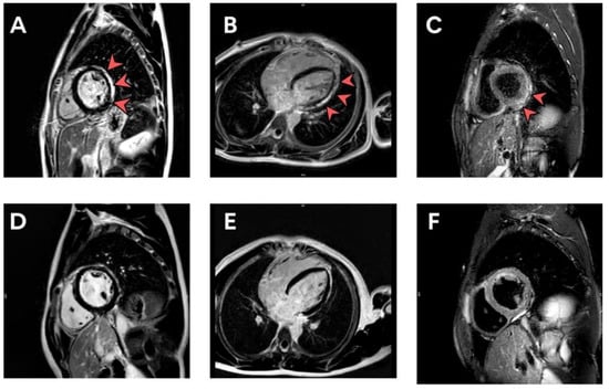 (A–F) cMRI illustrating LGE in a patient with subacute myopericarditis at the time of diagnosis (A–C) and 5 months post-diagnosis (D–F). cMRI, cardiac magnetic resonance imaging; LGE, late gadolinium enhancement.