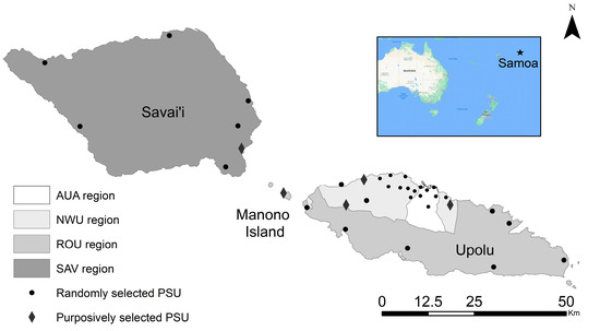 Map of Samoa showing approximate locations of the 35 primary sampling units (PSUs). Villages included in each PSU are given in Supplementary Figure S1.1. Spatial data on country, island, region, and village boundaries in Samoa were obtained from the Pacific Data Hub (pacificdata.org accessed on 8 July 2020) and DIVA-GIS (diva-gis.org, accessed on 12 August 2019). Regions are Apia Urban Area (AUA), North-West Upolu (NWU), Rest of Upolu (ROU) and Savai’i (SAV).