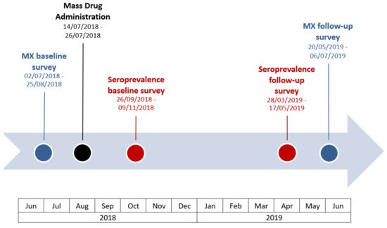 The baseline survey was conducted from 26 September to 9 November in 2018, within two months after the start of MDA. Considering that Ag persists for at least months after treatment, results were expected to be very similar to pre-MDA Ag prevalence. The follow-up survey was conducted from 28 March to 17 May 2019, seven to nine months post-MDA and immediately prior to the 2019 MX survey (see Figure 2 for survey timeline). The survey design has been previously described [13]. We tested blood samples for Ag using Alere Filariasis Test Strips. For Ag-positive samples, blood slides were prepared and screened for the presence of Mf using standard procedures [13].