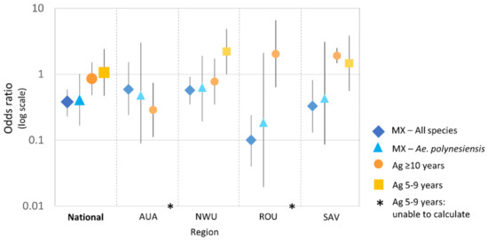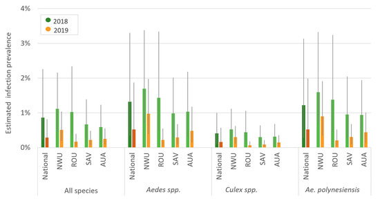 MX showed a significant reduction in mosquito infection prevalence from 2018 to 2019 nationally and in all regions for “all species” and Ae. polynesiensis (Figure 7). After adjusting for mosquito species and clustering within PSUs, infection prevalence at the national level was lower in 2019 than 2018 (OR 0.4, 95% CrI 0.2–0.6) and in three regions (NWU: OR 0.6 [95% CrI 0.4–0.9], ROU: OR 0.1 [95% CrI 0–0.2], SAV: OR 0.3 [95% CrI 0.1–0.8]). Estimated prevalence declined in AUA, but the difference was not statistically significant (OR 0.6, 95% CrI 0.2–1.5). Given the low prevalence, these ORs closely approximate prevalence ratios. For example, infection prevalence in mosquitoes in ROU was ~90% (i.e., 1–0.1) lower in 2019 than in 2018.