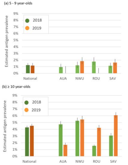 There was no significant change in Ag prevalence between the two surveys in participants aged ≥10 years or 5–9 years at the national level. Variable patterns were observed at the region level, with a significant increase in Ag prevalence between 2018 and 2019 in 5–9-year-olds in NWU (OR 2.2, 95% CI 1.0–4.9) and in ≥10-year-olds in SAV (OR 1.9, 95% CI 1.5–2.5) but a significant decrease in ≥10-year-olds in AUA (OR 0.3, CI 0.1–0.7).