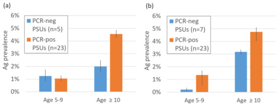 In 2018, of the 28 random PSUs where both MX and human Ag surveys were conducted in both years, PCR-positive pools were found in 82% of PSUs (23/28). This decreased to 77% of PSUs in 2019 (23/30). Ag prevalence in PCR-positive PSUs was higher than in PCR-negative PSUs for both age groups and years except for in 5–9-year-olds in 2018 (Figure 6). The distribution of PCR-positive and Ag-positive PSUs is given in Supplementary Figure S5.1.