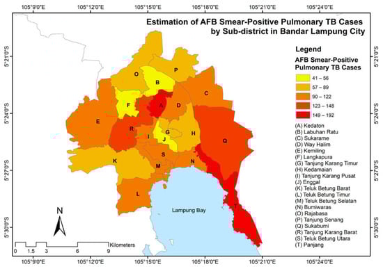 Estimated and real AFB smear-positive pulmonary tuberculosis (TB) by sub-districts in Bandar Lampung.