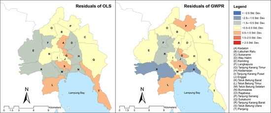 Figure 5 demonstrates that visually, the residuals of GWPR were lower than the residuals of OLS. The residuals of the GWPR model were in the range of −1.5 to 1.5 Std. Dev. We identified only two sub-districts in the range of <−2.5 Std. Dev. (the Teluk Betung Barat and Bumi Waras sub-districts). Teluk Betung Barat had a reasonably medium overprediction value due to the high number of pulmonary TB cases affected by the Tanjung Karang Barat and Teluk Betung Selatan. Bumi Waras had also a reasonably medium overprediction value due to the high number of pulmonary TB cases affected by Panjang and Sukabumi. An extremely high or low number of cases in a sub-district could have triggered an overprediction or underprediction in its neighboring sub-districts. However, we discerned somewhat low residuals values in other sub-districts as the GWPR yielded relatively higher R2, adjusted R2, and AICc than OLS. The relatively small residuals in most sub-districts indicate that the overall number of cases estimated by the GWPR model was close to the actual value.