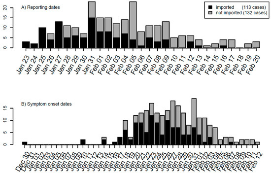 The outbreak data for COVID-19 were collected from the Shaanxi provincial government website from 23 January to 20 February 2020. Variables used in the line list data for COVID-19 included age, gender, place of origin, exposure date, symptom onset date, hospital admission date, close contacts, cluster number, medical history, symptoms, and travel history. The serial interval and incubation period are estimated by applying the R language function fitdistr to the line list data of the Shaanxi outbreak. Among 245 cases reported during the period, 113 were imported from outside of Shaanxi (Figure 1A). The dates of symptom onset were recorded for 210 cases, from which the delay from symptom onset to reporting was estimated to have a mean of 7.54 days and a standard deviation of 4.12 days. The other 35 cases whose dates of symptom onset were missed were imputed from their reporting dates and the distribution of delays from symptom onset to reporting. The timeline of dates of symptom onset of 245 cases is shown in Figure 1B.