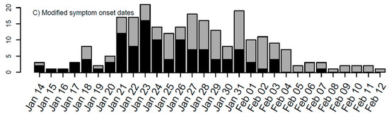 To provide the direct dates for local transmission modelling, we constructed modified dates of symptom onset for imported cases. If the date of symptom onset of one imported case was earlier than the date of entry into Shaanxi province, then its modified date of symptom onset is its entry date; otherwise, the modified date of symptom onset is its date of symptom onset. There are 19 cases whose dates of the symptom onset were earlier than their entry dates. This modification of symptom onset dates of imported cases will help in modelling the transmission within Shaanxi province. With these arrangements, the timeline of modified dates of symptom onset is shown in Figure 1C.