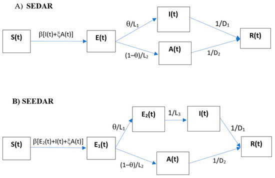 Ferretti et al. [46] show that 30% to 50% of all transmissions are pre-symptomatic transmissions. To take the pre-symptomatic transmission into account, we modify the above SEDAR model by including a secondary exposure compartment (see Figure 2B). For simplicity, this new compartment is assumed to be asymptomatic but of the same infectivity as the symptomatic infections. The corresponding equations are modified as:
