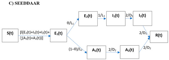In view of the empirical observations that the infectious period follows the gamma distribution rather than the usual exponential distribution [47,48,49,50,51,52], we introduce the intermediate compartments by evenly dividing diseased compartment I(t) into I1(t) and I2(t), and dividing asymptomatic compartment A(t) into A1(t) and A2(t). Adding the two new compartments to Equation (6), the model equations for the SEEDDAAR model are given as: