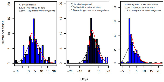 Distributions of (A) serial interval (SI), (B) incubation period, and (C) delay from date of symptom onset to hospital visit. The blue pillars represent the data, and the estimate of the mean and its standard deviation in brackets are obtained by fitting gamma distribution to nonnegative data (red curve) and normal distribution to all data (black curves shown in the graphs).