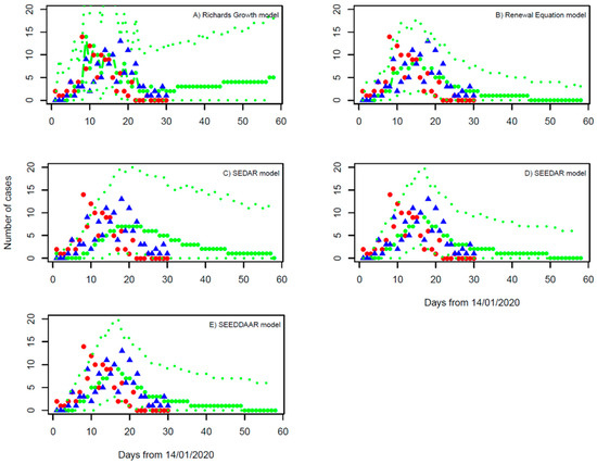 Fitting of (A) the Richards growth model, (B) the renewal equation model, (C) the SEDAR model, (D) the SEEDAR model, and (E) the SEEDDAAR model to outbreak data of symptom onset dates. Red dots represent the imported cases, and the blue triangles are the cases locally transmitted in Shaanxi province. The thick green line represents the median of MCMC samples, and the thin lines represent their upper and lower levels of 95% confidence intervals.