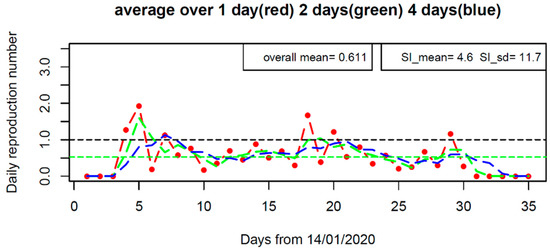 The effective reproductive number (Rt) along the course of the outbreak in Shaanxi province, China under the SI distributions of SI_mean = 4.6 days, SI_sd = 11.7 days (the Maximum likelihood estimate of SI from model calibration of the renewal equation). Rt is evaluated by averaging over one, two, and four days.