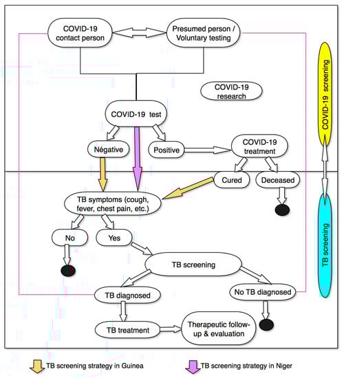 Guidance on how to ensure the continuity of essential services for people affected by TB during the COVID-19 pandemic has been developed by the World Health Organization (WHO), which promotes innovative person-centered approaches and integrated interventions to fight the two diseases [9]. Guinea and Niger are two low-income countries facing the COVID–19 pandemic, which occurs against a backdrop of an annual TB incidence of 176 and 84 cases per 100,000 persons, respectively [1]. The majority of TB case finding in each country is passive, though some active case finding activities occur. The experience of Ebola virus disease in Guinea has shown the degree of destabilization that uncontrolled epidemics can have on the health system, including TB prevention efforts, as well as broader socioeconomic consequences, and the attendant impacts on health [11,12]. In Guinea and Niger, the COVID-19 pandemic has exacerbated current challenges facing national TB programs (NTPs), affecting case finding and underdiagnosis and/or underreporting of tuberculosis cases. Despite efforts, TB treatment coverage in Guinea and Niger was 66% and 56%, respectively, in 2020 [13].
