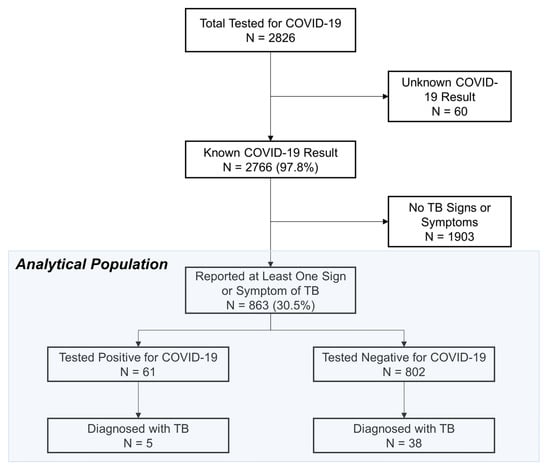 Data on the following variables were collected from participants and analyzed during this study: socio-demographic characteristics (country of origin, age in years, sex, current occupation, residence), presence of TB-related symptoms (yes/no: cough lasting more than two weeks, fever, weight loss, night sweats, other signs), recent contact (defined as within the last 6 months) with a TB case (yes/no), history of anti-TB treatment (new or previous treatment unknown, previously treated or relapse), bacteriologically confirmed diagnosis of TB (yes/no) with microscopy or Xpert MTB/RIF result, and COVID-19 test results (PCR positive, PCR negative). The operational definitions used for TB and COVID-19 are those published by the WHO [9,10].
