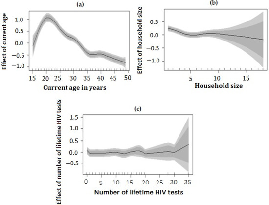 Figure 3 shows the non-linear effects of current age in years, household size, and number of lifetime HIV tests and corresponding 95% confidence intervals (CIs) represented by the shaded region from the best-fitted model.
