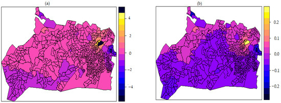 Findings for the posterior mean and 95% credibility interval for the smooth-term variance components for both non-linear and spatial effects are presented in Table 2. The accuracy of an effect is the inverse of its variance. Consequently, the higher the accuracy, the smaller the variance of the effect. The precision corresponding to the structured spatial effect (87.97) was much higher than that of the unstructured spatial effect (27.934), thus suggesting that the unstructured spatial effect was more assertive, and previous studies support this observation [63,75,76].