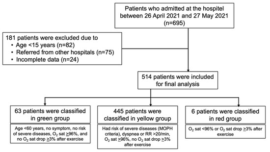 We retrospectively reviewed the medical records of all patients who were admitted to a hospitel in Bangkok, Thailand, between 26 April and 27 May 2021. The inclusion criteria were age ≥ 15 years and being directly admitted from home with a laboratory-confirmed diagnosis via the detection of SARS-CoV-2 using reverse transcription polymerase chain reaction (RT-PCR) (Bio-Rad Laboratories, Inc.) with nasopharyngeal swabs. Those who were readmitted or referred from other hospitels or other healthcare facilities were excluded.