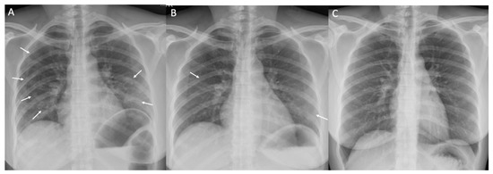 Chest X-rays during the hospitel course determined by Rama Co-RADS in one representative patient. A 43-year-old woman with a body mass index of 24 kg/m2 presented with cough and dyspnea for 1 day (13 days after contact). (A) Initial chest X-ray obtained on admission (day 2 of illness) shows multifocal poorly defined patchy opacities and/or consolidation (arrows) in both lungs, compatible with COVID-19 pneumonia (Rama Co-RADS category 5). (B) Follow-up chest X-ray obtained on day 6 of illness and after 4 days of favipiravir and corticosteroid treatment shows a marked improvement with faint residual opacities (arrows) in some affected areas. (C) Follow-up chest X-ray obtained on day 13 of illness shows complete resolution of COVID-19 pneumonia.