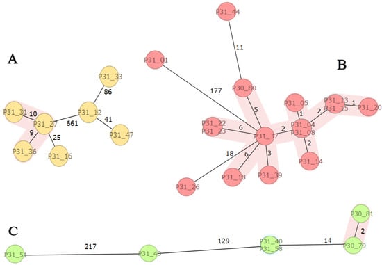 SeqSphere analysis of E. coli high-risk clones: ST131, ST410, and ST617. Figure Legend: Minimum spanning three based on cgMLST analysis of ESBL-producing E. coli ST131 ((A); n = 7), ST410 ((B); n = 16), and ST617 ((C); n = 6) isolates. The isolates are coloured by sequence type (ST) and numbered according to Supplementary Table S1. Clusters are coloured in pink and related to the cluster distance threshold of ≤10 allele differences as given in numbers along the lines between individual isolates.