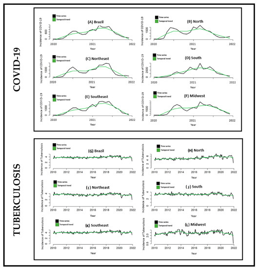 The time series of TB incidence rates in Brazil and its macro-regions can be seen in Figure 1G–L, which shows that the highest rates of the disease were recorded in the North Region, and the lowest rates were recorded in the Midwest Region of the country, where the registered indices were the only ones below the national indices.