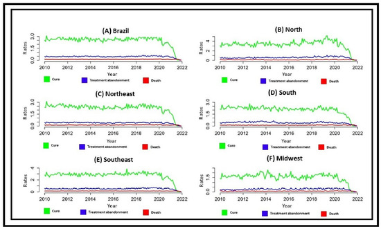 Monthly time series of tuberculosis outcomes in Brazil and its macro-regions (2010–2021). Legend: Cure—when a person with TB undergoes the complete treatment regimen and presents two negative smears, one in the follow-up phase and the other at the end of treatment. Treatment abandonment—when a person with TB fails to attend the health unit or fails to take the medication for more than 30 consecutive days. Death—when TB is the declared underlying cause, regardless of whether or not the person was being treated for TB. (A)-Outcome rate of tuberculosis cases reported in Brazil (green line = cure, blue line = treatment abandonment, red line = death). (B)-Outcome rate of tuberculosis cases reported in North Region of Brazil (green line = cure, blue line = treatment abandonment, red line = death). (C)-Outcome rate of tuberculosis cases reported in the Northeast Region of Brazil (green line = cure, blue line = treatment abandonment, red line = death). (D)-Outcome rate of tuberculosis cases reported in South Region of Brazil (green line = cure, blue line = treatment abandonment, red line = death). (E)-Outcome rate of tuberculosis cases reported in the Southeast Region of Brazil (green line = cure, blue line = treatment abandonment, red line = death). (F)-Outcome rate of tuberculosis cases reported in the Midwest Region of Brazil (green line = cure, blue line = treatment dropout, red line = death).