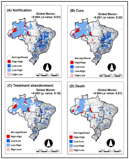 Regarding treatment abandonment (Figure 3C), the region of Brazil that stands out the most is the North Region, with most municipalities classified as Low–High and some classified as High–High. The rest of the country has, for the most part, municipalities classified as Low–Low and a few classified as High–High or High–Low.