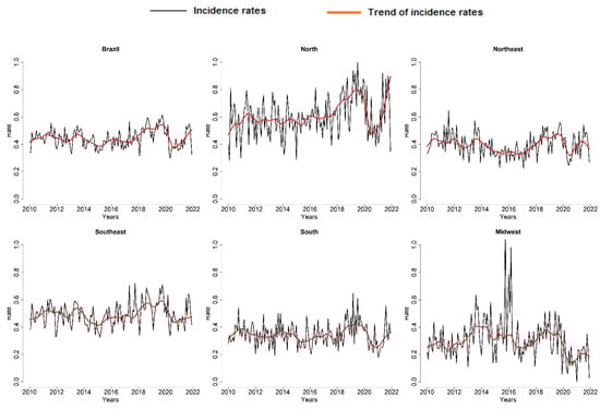 For temporal analysis, time series of incidence rates were built according to the month of notification of each case, in Brazil and the regions, and then the seasonal decomposition of time series method was applied using LOESS (STL) [15].