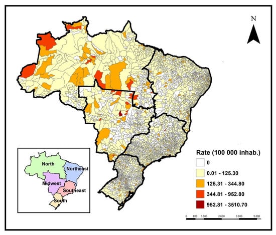 Areas of the high occurrence of the disease in children under 15 years of age were concentrated in municipalities in the north region, especially in regions bordering countries such as Colombia and Venezuela, and in municipalities in the midwest, north–east, and southern regions of Brazil. Some Brazilian states such as Amazonas, Roraima, Mato Grosso, Mato Grosso do Sul, and the coast of the states of Rio Grande do Norte, Paraíba, Pernambuco, and Alagoas stood out for the number of municipalities, with high occurrence in their territories.