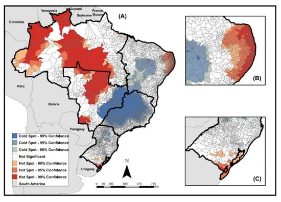 Figure 3 presents the results of the analysis of the local spatial association of rates using the Getis-Ord Gi* technique, which allowed the identification of areas of high occurrence (hot spots) and low occurrence (cold spots) according to the municipalities of residence.