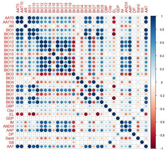 As demonstrated in Figure 2, correlation diagnostics of environmental factors showed that most climate factors were highly correlated. To select the most predictive factors, we take the following selection criteria: if the correlated factors belong to the same dataset, such as the meteorological factors, bioclimatic factors, geographical factors, or socioeconomic factors, the factor that with the largest correlation coefficients will be kept for modeling, while the other correlated factors will be removed. Specifically, AAT had a strong correlation with AAT0 and AAT10 in the same data set, as did BIO1, BIO6, BIO9, and BIO11 for the bioclimatic factors. Because AAT correlates well with the other factors, AAT was selected for model training. The other factors were deleted. AAP had a strong correlation with annual precipitation BIO12, BIO13, and BIO16 for bioclimatic factors, and AAP was selected. BIO4 was strongly correlated with BIO7, hence the former was deleted. BIO19 had a strong correlation with BIO17 and BIO14, hence BIO19 was selected for model training. El, a geographic environmental variable, was related to BIO8. Since El was stronger than other climate factors, it was retained.