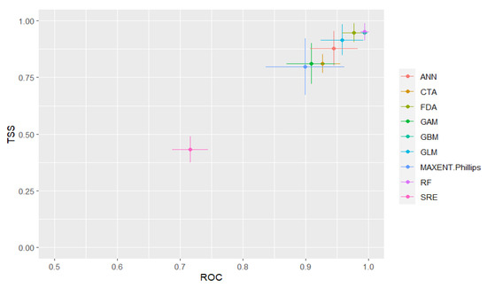 Model performance was assessed with test datasets using threshold-independent and threshold-dependent measures. In this study, the most commonly used indices in the biomod2 package, which are, respectively, the receiver operating characteristic (ROC, the threshold-independent index) [24], kappa statistic (threshold-dependent index), and true skill statistic (TSS, threshold-dependent index), were employed to assess the performance of the single and the ensemble ecological niche models [25].