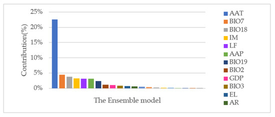 The importance of environmental factors of the ensemble model was analyzed by using the variable importance calculation function of the biomod2 package. The principle was to shuffle a single data variable and then assess the predictive models with the “shuffled” dataset. A simple Pearson’s correlation between the reference prediction and the “shuffled” prediction was computed to measure the contribution rate of the variable to the model. The contribution rate of the environmental factors to the ensemble model was assessed with the biomod2 package. The percentage of different environmental factors was calculated and sorted to identify the main influencing factors.