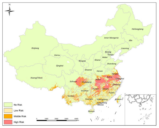 In this study, the standard ecological niche models, which have high prediction accuracy, were integrated into an ensemble model. The results have shown that schistosomiasis high-risk regions were found to be predominantly located in southern Hubei Province, northern Hunan Province, central Anhui Province, northern Jiangxi Province, and southern Jiangsu Province, where the epidemic of schistosomiasis is under control. These predictions are in agreement with the distribution of transmission-controlled and -interrupted areas of China in 2018 [9].