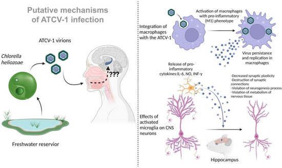 The Chlorovirus genus of the Phycodnaviridae family includes large viruses with a double-stranded DNA genome [1]. The natural hosts of these viruses are single-celled green algae of the Chlorella genus, with a particular virus species infecting a specific algae species. Chloroviruses are widely distributed in freshwater bodies around the world and have been isolated from freshwater sources in Europe, Asia, Australia, and North and South America [2,3]. One representative of chloroviruses is Acanthocystis turfacea chlorella virus 1 (ATCV-1), hosted by Chlorella heliozoae. A few publications in the last ten years about the potential effects of ATCV-1 on the human brain sparked interest among specialists in the field of human infectious pathology.