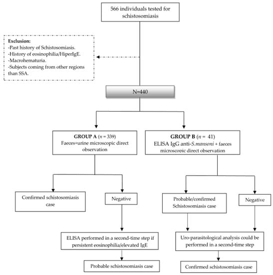 The study was conducted in two out-patient units specialized in tropical medicine, belonging to the International Health Program of Catalan Institute of Health (PROSICS) in Barcelona, Spain. Both units provide free medical care to self-referred individuals and referred cases from general practitioners and other medical specialists, public health services and non-governmental organizations (NGOs). Each clinic performs a different schistosomiasis screening strategy: (A) hemogram and feces and urine concentration techniques for direct examination, followed by S. mansoni serology if non-explained eosinophilia was present, and (B) S. mansoni serology and uroparasitological direct examination at a later time in case of a positive serology. Coproparasitological analysis was also performed in group B patients as part of general parasitosis screening, but not specifically for Schistosoma screening. All samples were analyzed at the Parasitology Unit of Vall d’Hebron Microbiology Department.
