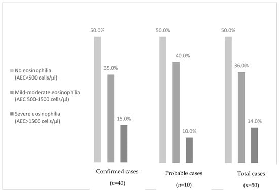 Grades of eosinophilia in schistosomiasis cases are represented in Figure 3. No significant differences were found in the presence of eosinophilia between subjects with confirmed probable schistosomiasis.