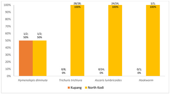 Intestinal helminthic distribution in Kupang and North Kodi, East Nusa Tenggara; n = 51 children. Hymenolepis diminuta was detected in a total of 2 children; Trichuris trichiura was detected in a total of 28 children; Ascaris lumbricoides was detected in a total of 24 children; Hookworm was detected in a total of 1 child (one child had ≥1 helminthic parasites).