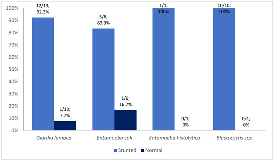 Intestinal protozoan distribution in stunted and normal children in East Nusa Tenggara; n = 30 children. Giardia lamblia was detected in a total of 13 children; Entamoeba coli was detected in a total of 6 children; Entamoeba histolytica was detected in a total of 1 child; Blastocystis spp. was detected in a total of 10 children (one child had ≥1 protozoan parasites).