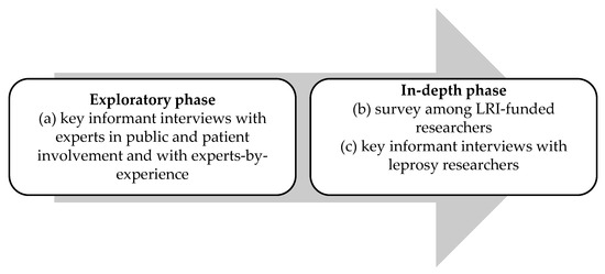 For this study, a cross-sectional design with a mixed-methods approach was used including a qualitative component with key informant interviews and a quantitative component with an online survey. In the exploratory phase (a), key informant interviews with experts in PPI, and with experts-by-experience were conducted to explore their interpretation of meaningful engagement and to identify barriers and opportunities in the leprosy context. These exploratory interviews were used to inform the in-depth phase (b, c), consisting of a survey among LRI-funded researchers and key informant interviews with leprosy researchers (Figure 1). The aim of the survey was to investigate current levels of engagement throughout the research cycle and researchers’ experiences in this, in terms of experienced barriers and perceived outcomes and impact. The aim of the key informant interviews with leprosy researchers was to discuss the findings from the exploratory phase more in-depth, and to explore potential opportunities to enhance engagement in the leprosy context.