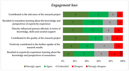 Participants’ perceived degree of agreement regarding statements about their experiences with engagement of experts-by-experience in their research.
