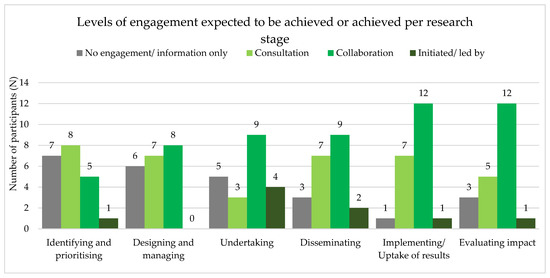 Resulting from the survey, Figure 3 presents the levels of engagement that are expected to be achieved or that have been achieved—depending on whether the project was completed yet or not—indicated per research stage.