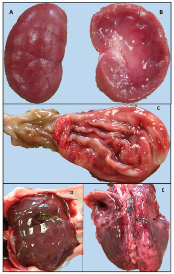 Gross findings of the kitten positive for FPV and Leptospira interrogans serogroup Australis ST 24. Left kidney dorsal and longitudinal section: multifocal, ill-defined cortico-midline demarcation and a prominent renal cortex with multifocal, rarely coalescent, bright red radial striations (A,B). (B) Stomach and proximal intestine (duodenum): catarrhal-haemorrhagic gastritis, erosive alteration of the mucosa of the pyloric region. (C) Increased size of the liver with blurred margins and slight diffuse prominence of the parenchyma. (D) Severe pulmonary edema and haemorrhagic suffusions: area of adhesion between the middle and caudal lobes of the right lung (arrow) (E).
