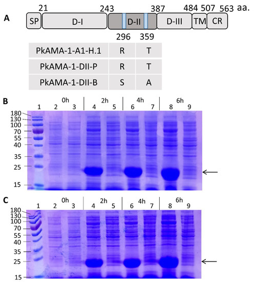3.1. Recombinant Proteins Expression of PkAMA-1-DII-P and PkAMA-1-DII-B