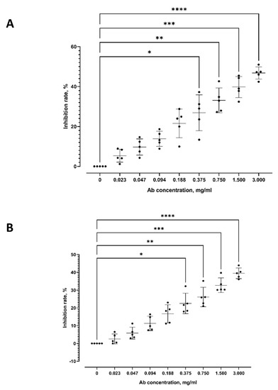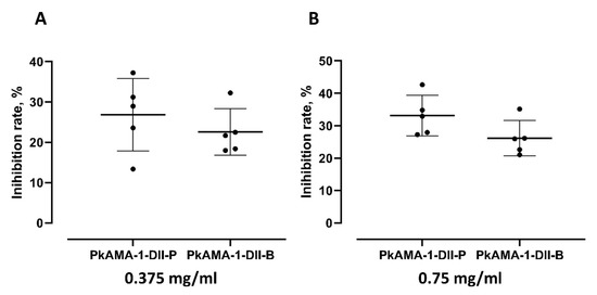 We compared the parasite invasion inhibition exerted by anti-PkAMA-1-DII-P and anti-PkAMA-1-DII-B antibodies. Among the antibody concentration points that exerted significant parasite merozoite invasion (0.375, 0.75, 1.5, 3.0 mg/mL), a significant difference was found at 3.0 mg/mL, where anti-PkAMA-1-DII-P antibody exerted higher inhibition on the erythrocyte invasion (mean inhibition rate of 46.81%) than anti-PkAMA-1-DII-B (mean inhibition rate of 39.45%) (Figure 3A–D). Of the five biological replicates conducted, anti-PkAMA-1-DII-P recorded 42.41% and 50.97% as the lowest and highest invasion inhibition rate, respectively. On the other hand, the highest and lowest inhibition recorded in experiments conducted with anti-PkAMA-1-DII-B was 36.06% and 43.92%, respectively.