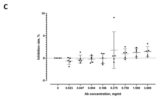 Antibodies against PkAMA-1-DII-P (IgG purity assessment: OD 260:280 ratio being 0.62) and PkAMA-1-DII-B (IgG purity assessment: OD 260:280 ratio being 0.62) were raised in rabbits (Supplementary Table S2). Anti-PkAMA-1-DII-P significantly inhibited P. knowlesi A1-H.1 from invading erythrocytes, and the inhibition rate increased with the working concentrations of the antibody (Figure 2A). Anti-PkAMA-1-DII-B demonstrated a similar trend of inhibition (Figure 2B). For anti-PkAMA-1-DII-P, significant inhibition was recorded at 0.375 mg/mL (inhibition rate: 26.87 ± 8.992%), 0.750 mg/mL (inhibition rate: 33.11 ± 6.226%), 1.500 mg/mL (inhibition rate: 39.79 ± 5.276%), and 3.000 mg/mL (inhibition rate: 46.81 ± 3.076%). For anti-PkAMA-1-DII-B, significant inhibition was recorded at 0.375 mg/mL (inhibition rate: 22.55 ± 5.768%), 0.750 mg/mL (inhibition rate: 26.17 ± 5.480%), 1.500 mg/mL (inhibition rate: 32.78 ± 4.089%), and 3.000 mg/mL (inhibition rate: 39.45 ± 3.004%). Of note, the control antibodies did not exert a significant effect on the parasite erythrocyte invasion (Figure 2C).