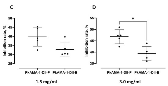 Comparison of merozoite invasion inhibition of anti-PkAMA-1-DII-P and anti-PkAMA-1-DII-B at different concentrations. (A) 0.375 mg/mL (p = 0.4206), (B) 0.75 mg/mL (p = 0.0952), and (C) 1.5 mg/mL (p = 0.0952). (D) A significant difference in inhibition was found between both antibodies at 3.0 mg/mL (p = 0.0159). (* p < 0.05).