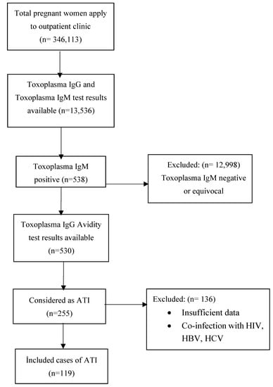 Between January 2016 and June 2022, 346,113 pregnant women were admitted to the Şanlıurfa Training and Research Hospital. Of these, 21,177 underwent analysis for toxoplasma IgG and toxoplasma IgM, but only 13,536 test results were available. In 538 of the patients, the toxoplasma IgM result was found to be positive. An avidity test was requested for 530 of these patients. After the evaluation of the avidity test results, 255 women were considered to have ATI. Patients who were co-infected with HIV, HBV, and HCV; those who were administered immunosuppressive therapy; and those whose complete data could not be accessed were excluded from the study. Finally, 119 patients were included in the study (Figure 1).