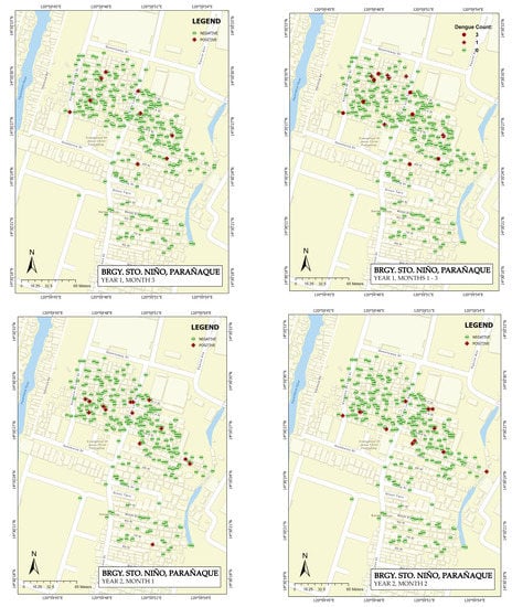 The recorded dengue cases for barangays San Dionisio and barangay Sto. Niño were mapped using ArcGIS Pro 2.9.1. The maps were generated per month, displaying the positive and negative serostatus test results. Figure 1 shows the generated maps for San Dionisio, while the maps for Sto. Niño are displayed in Figure 2. The yearly aggregate count was used to proceed with the spatial analysis using the spatial statistics tools available in ArcGIS Pro 2.9.1.