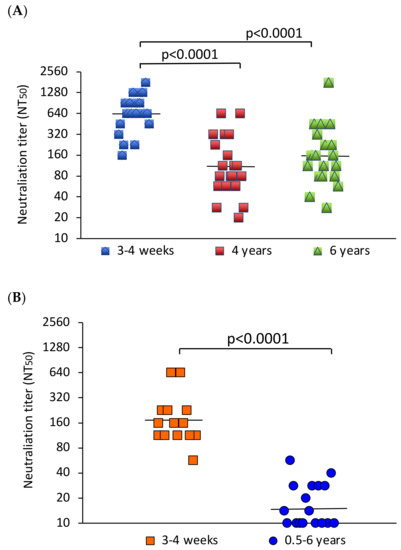 In comparison, all sera from the freshly JEV-vaccinated participants neutralized JEV, and 9 out of 17 in the group tested 0.5–6 years after vaccination neutralized the virus. The GMT of the fourteen sera obtained 3–4 weeks after JEV vaccination was 172. The GMT of the sera from earlier vaccination was 15. This difference was statistically significant (p < 0.0001) (Figure 1B).