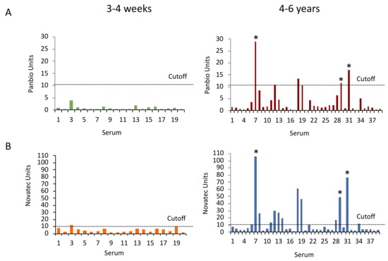 Panbio and NovaLisa Dengue IgG ELISA reactivity with sera from YFV-vaccinated individuals. (A) Panbio and (B) NovaLisa ELISA units with sera from 3–4 weeks (N = 20) and 4–6 years (N = 39) after YFV vaccination. Original Panbio measurement units were multiplied by 10. The dotted line indicates the cut-off for positive sera (11 assay units). Asterisks show sera that neutralized DENVs.